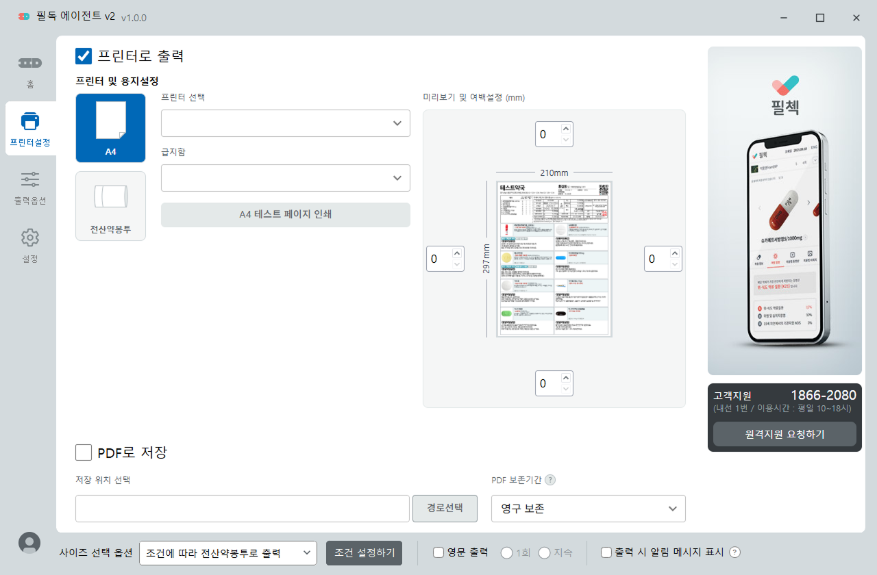 A4사이즈 또는 전산약봉투 사이즈를 선택하여 출력합니다.