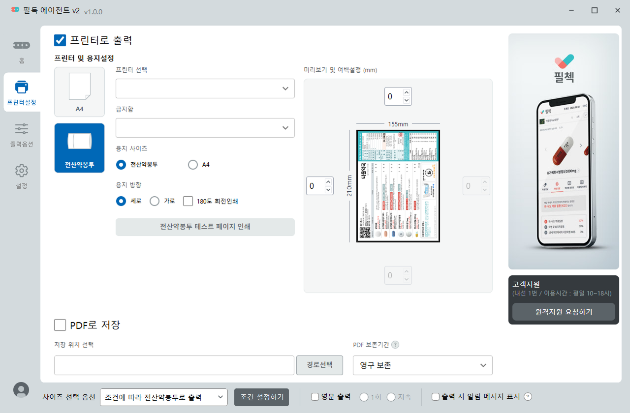 - 전산약봉투 사이즈만 출력 : 전산약봉투 사이즈를 고정하여 출력합니다.